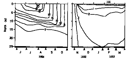 Title : Water temperature, South basin iso-therm (depth vs. month) (1986, 1982-1983)