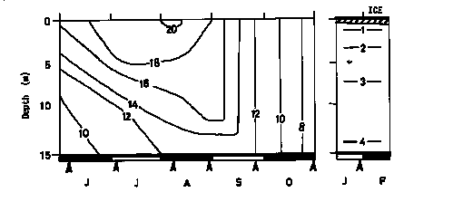 Title : Water temperature, North basin iso-therm (depth vs. month) (no dates)