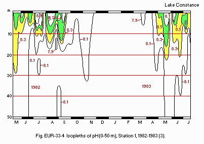 Title : pH isopleths of , monthly, by depth 0-250m (1982-1983)