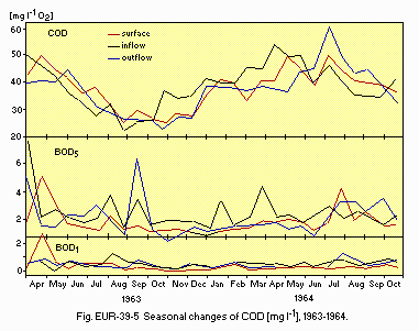 Title : Monthly, depth-time profile in a dry year (1964) and a wet year (1965) BOD1, BOD5 and COD, for surface, inflow and outflow (1963-1964)