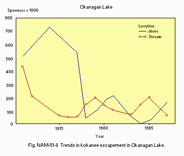 Title : Trends in kokanee escapement, by location (before 1975 - after 1985)