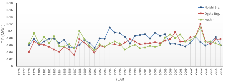 Title : T-P yearly mean, at Noishi bridge, Ogata bridge, lake center (1976-2016)