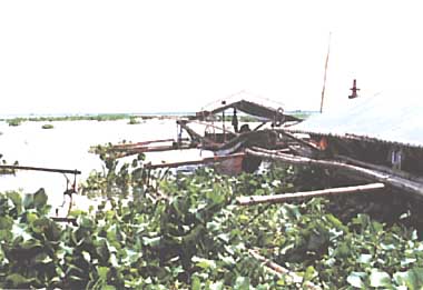Title : Water-hyachinth ( Eichhornia crassipes ) and fishing boats